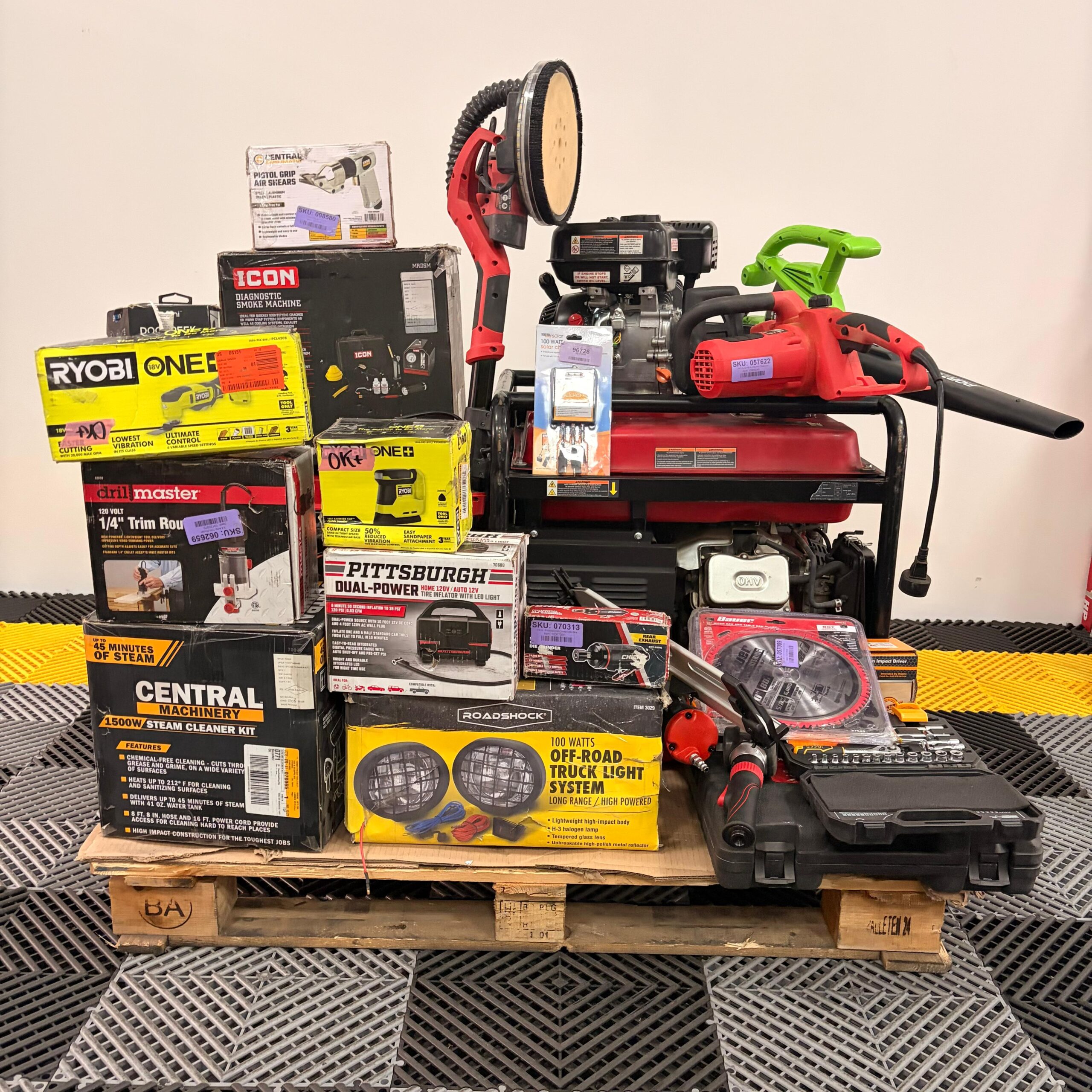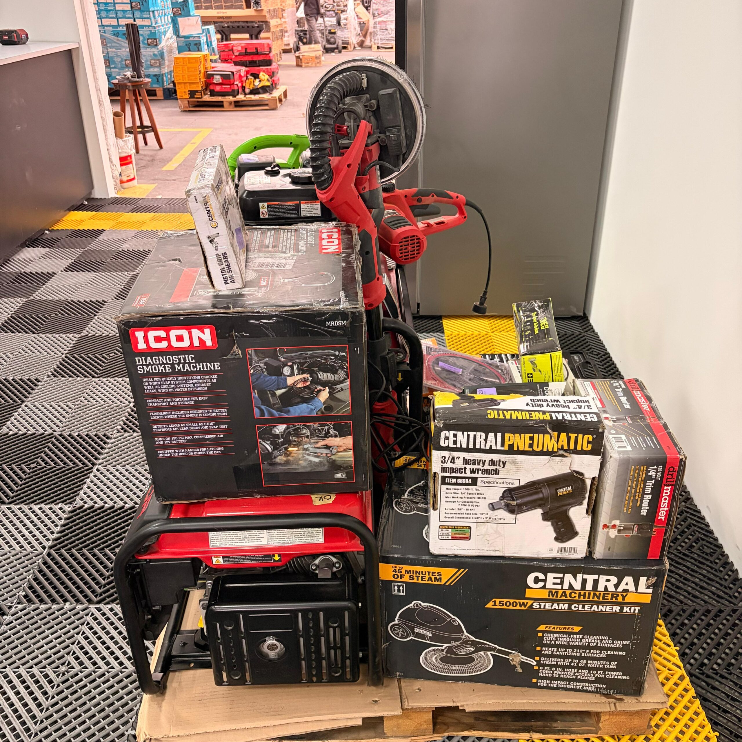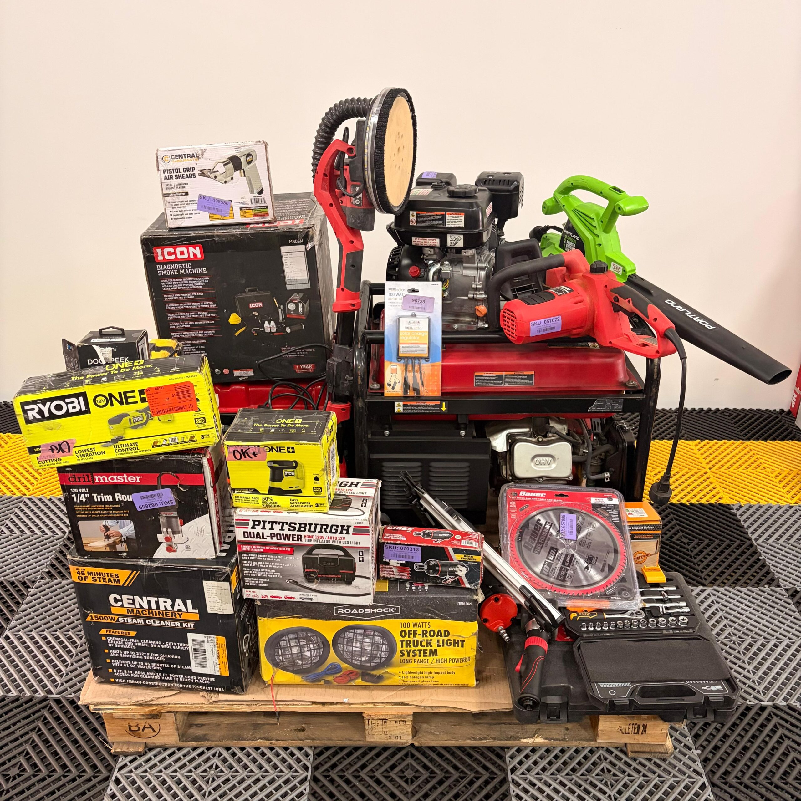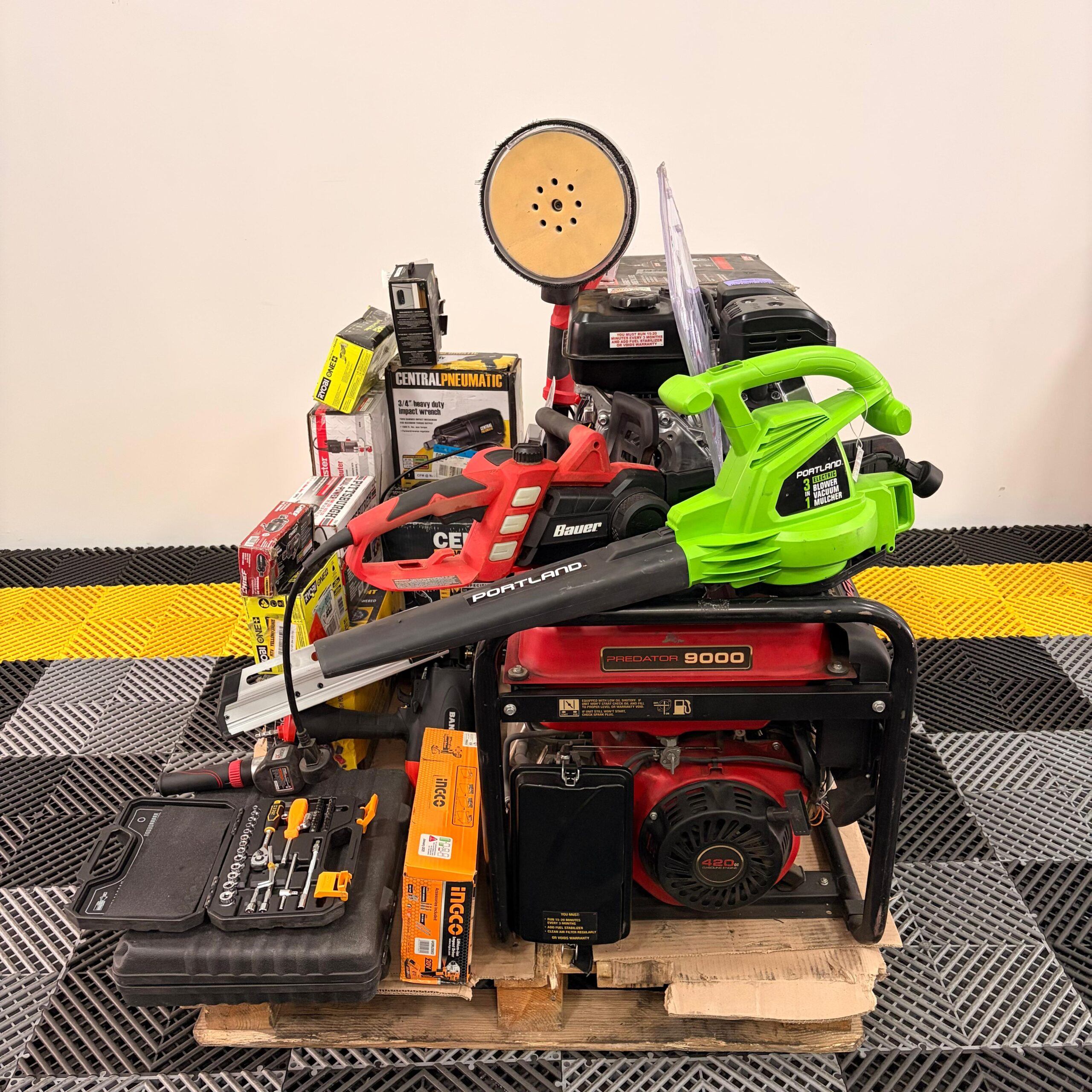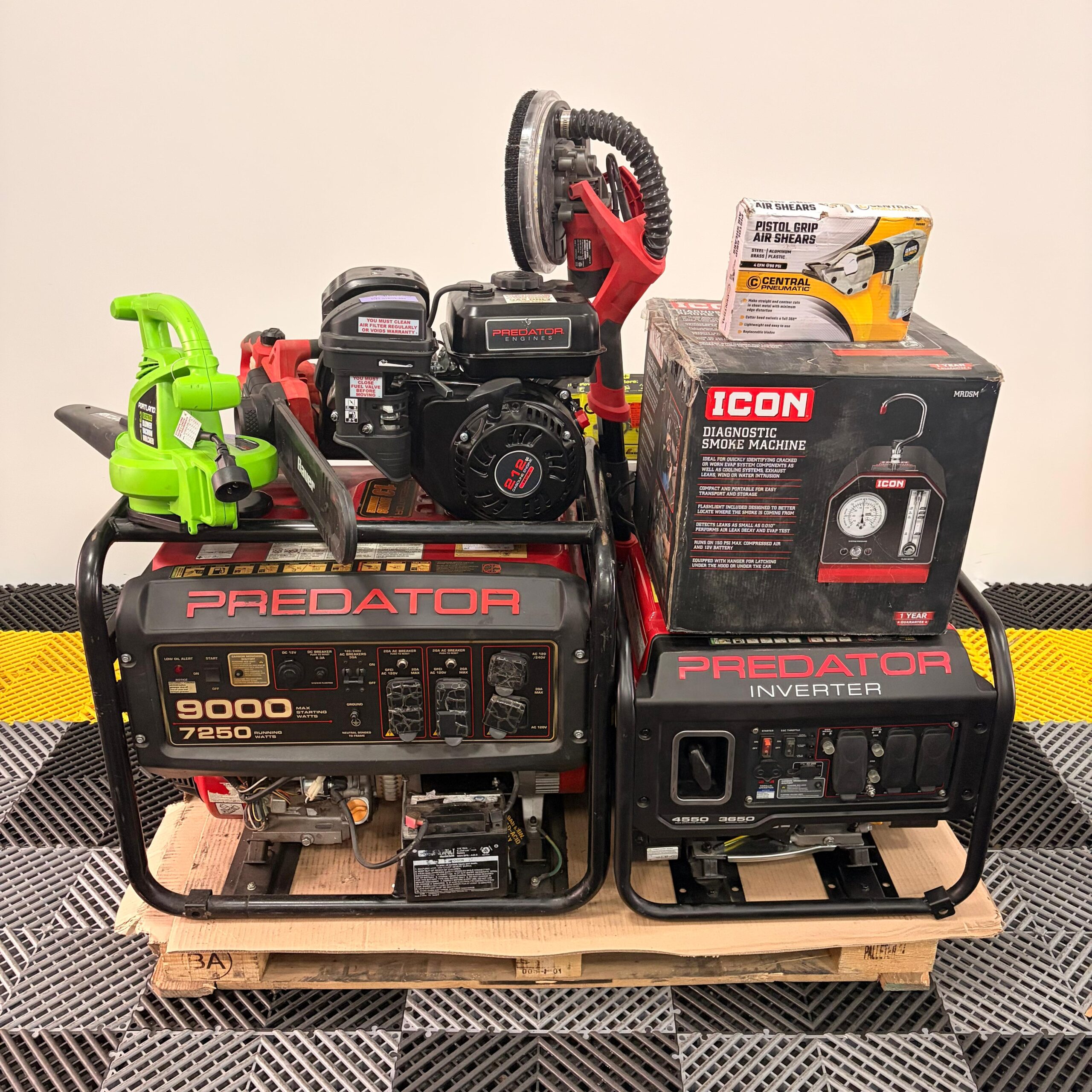 Incluye generador Predator 9000, generador inverter Predator, sopladora Portland, lijadora tipo jirafa Bauer, equipo Ryobi ONE+, máquina de humo diagnóstico ICON, inflador Pittsburgh, kit de vapor Central Machinery, herramienta neumática, accesorios y más.