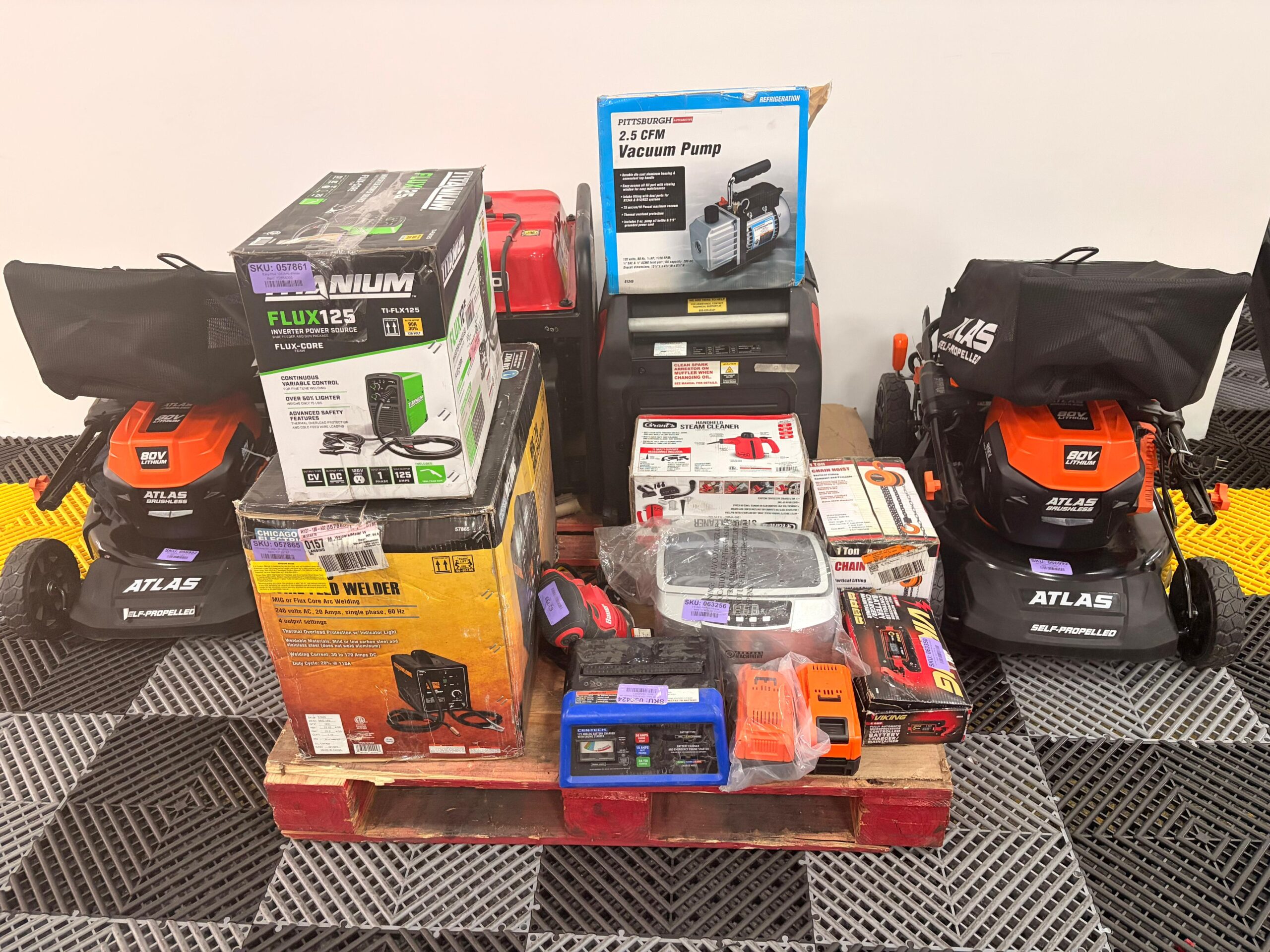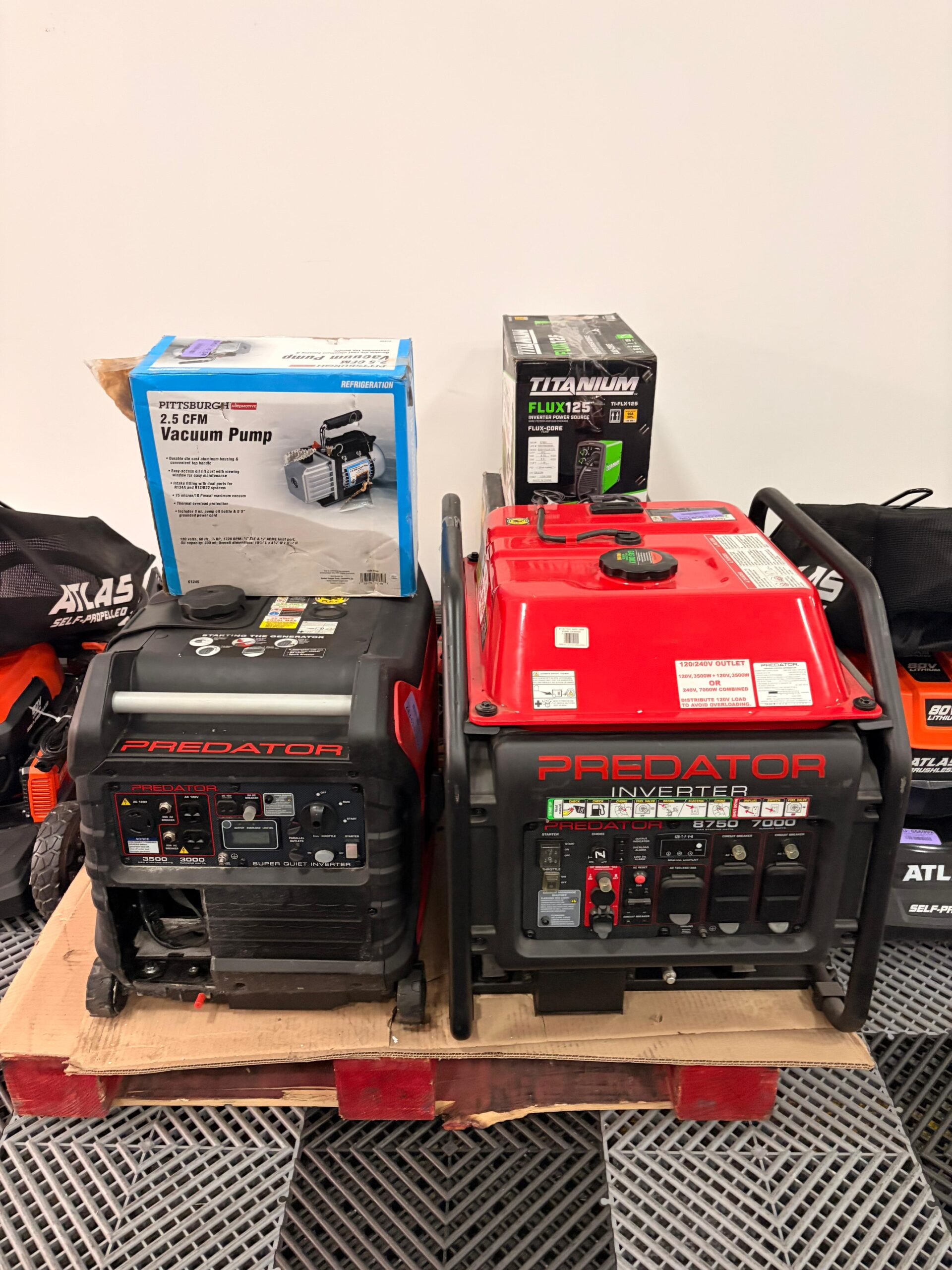 Incluye generadores Predator (inverter y portátil), máquina inverter Titanium Flux 125, soldadora Chicago Electric, bomba de vacío Pittsburgh, limpiador de vapor, equipo Atlas inalámbrico, cargadores, baterías y herramienta mecánica diversa.