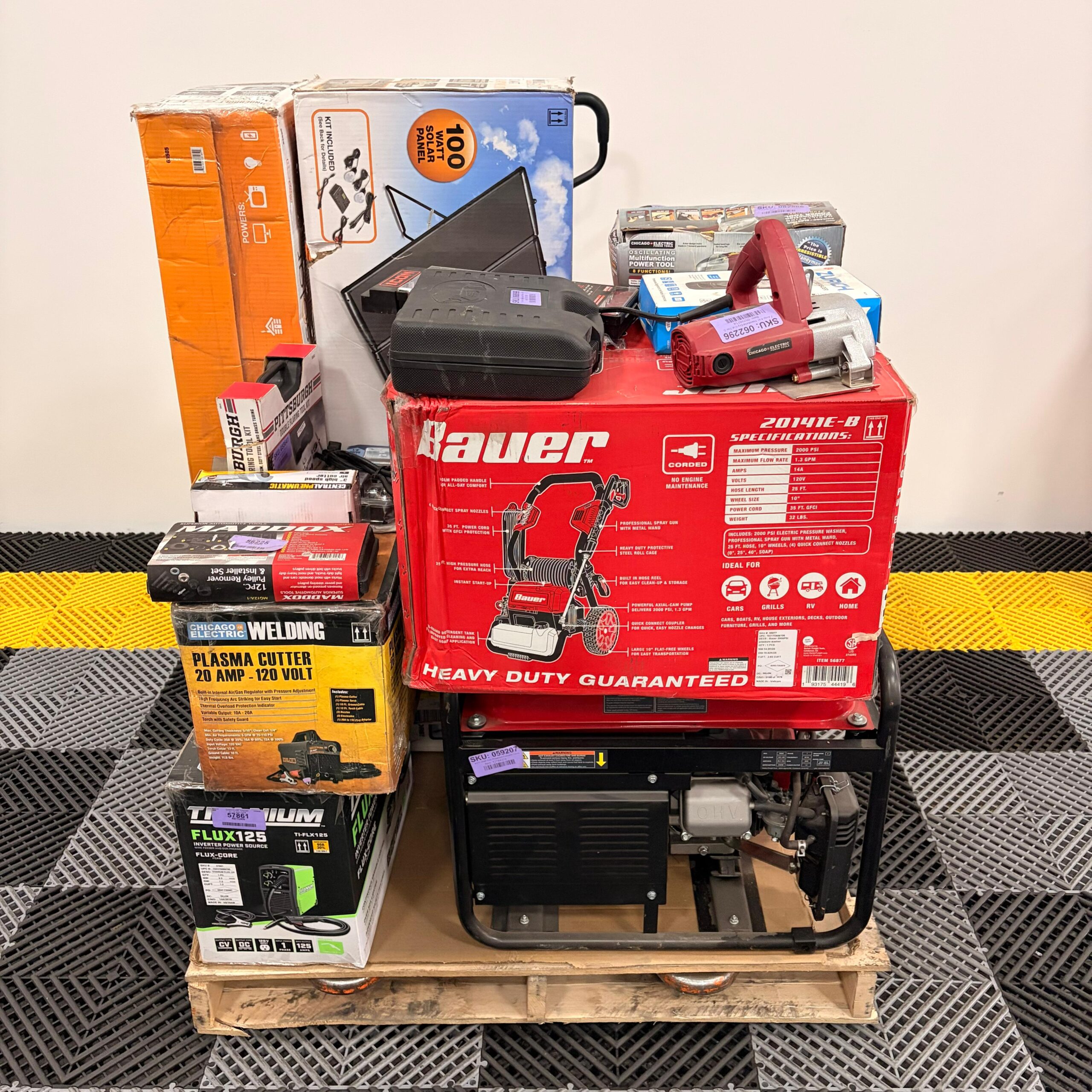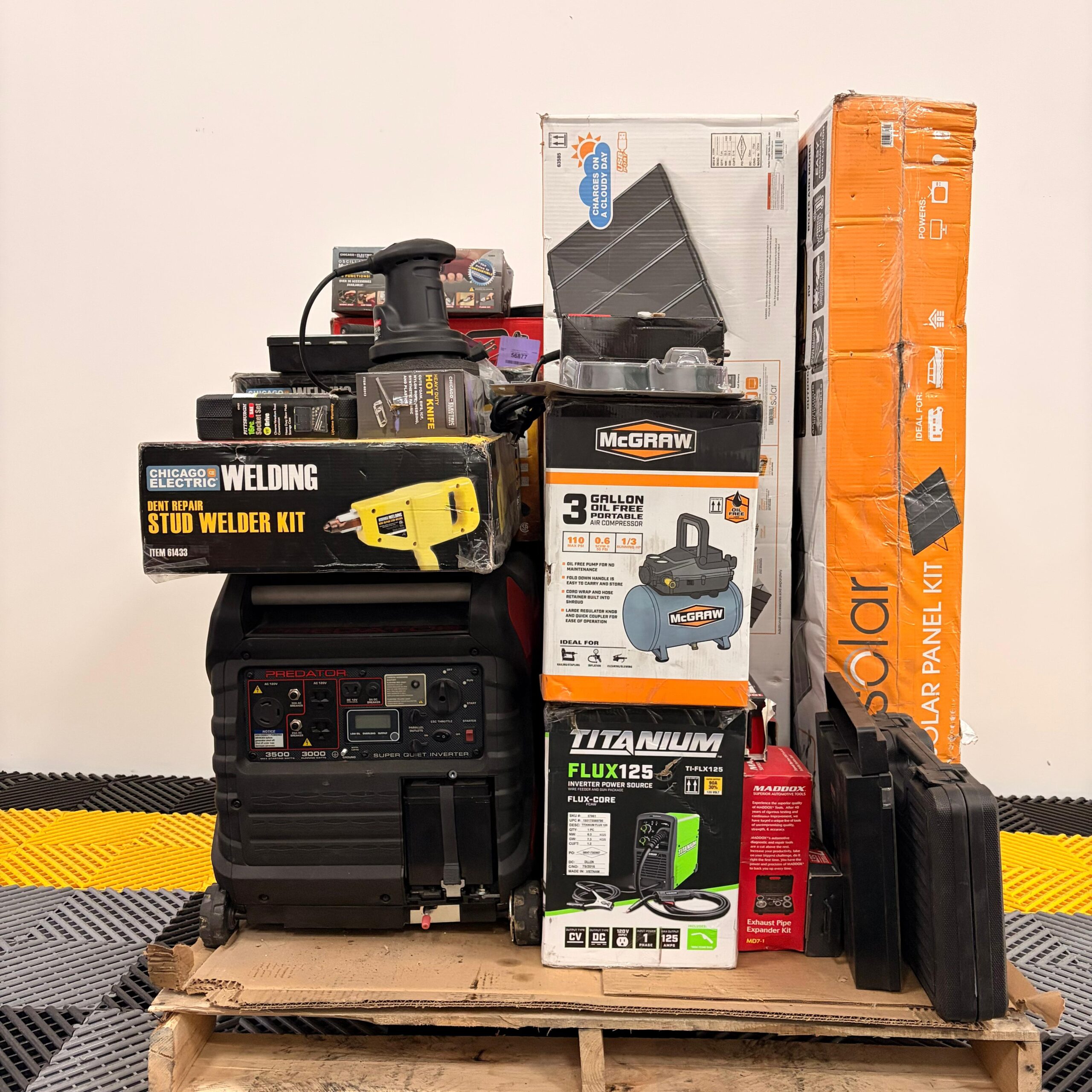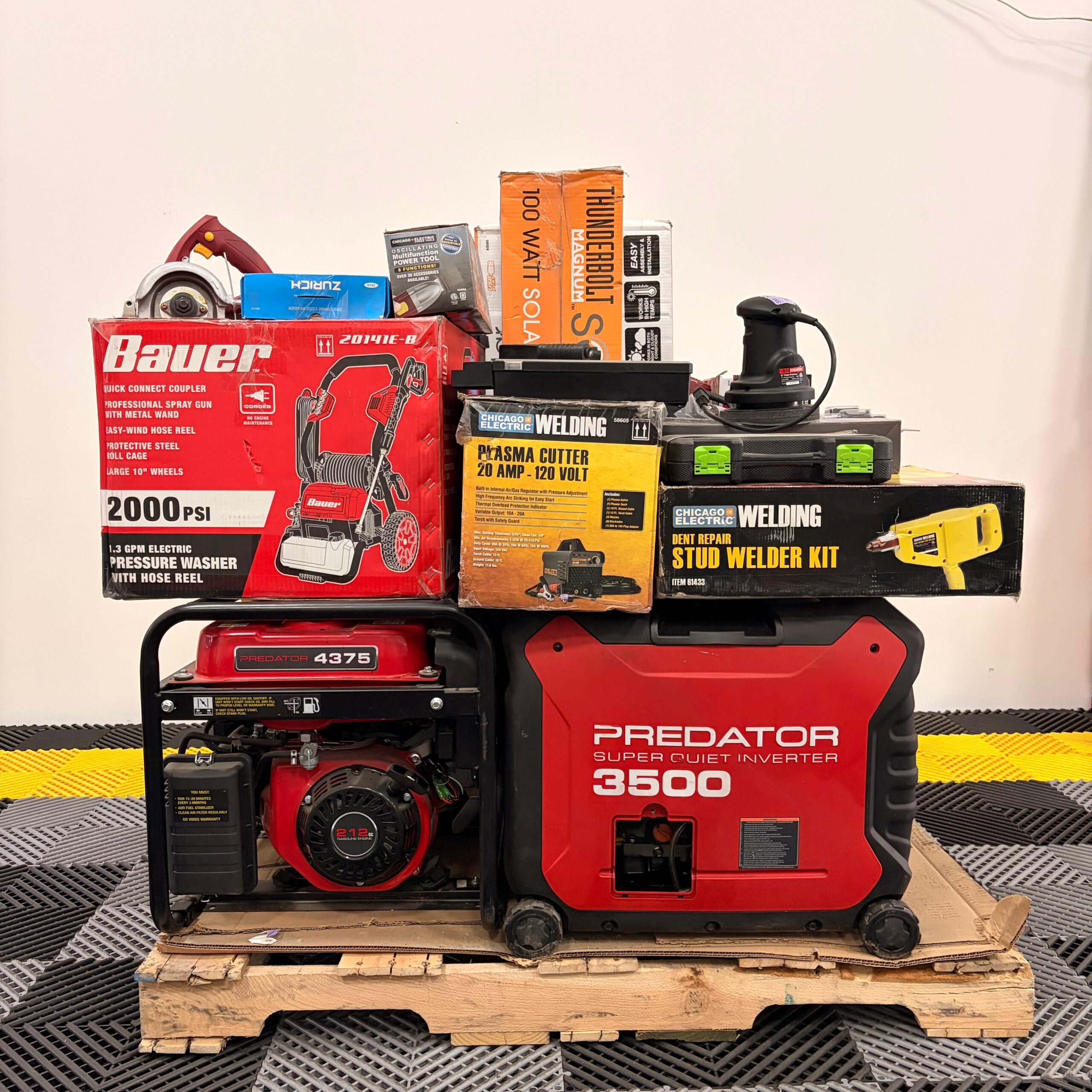 Incluye generador Predator 3500 inverter (super silencioso), hidrolavadora Bauer 2000 PSI, panel solar Thunderbolt de 100W, cortadora de plasma Chicago Electric, equipo de soldadura, lijadoras, herramientas eléctricas y accesorios diversos.