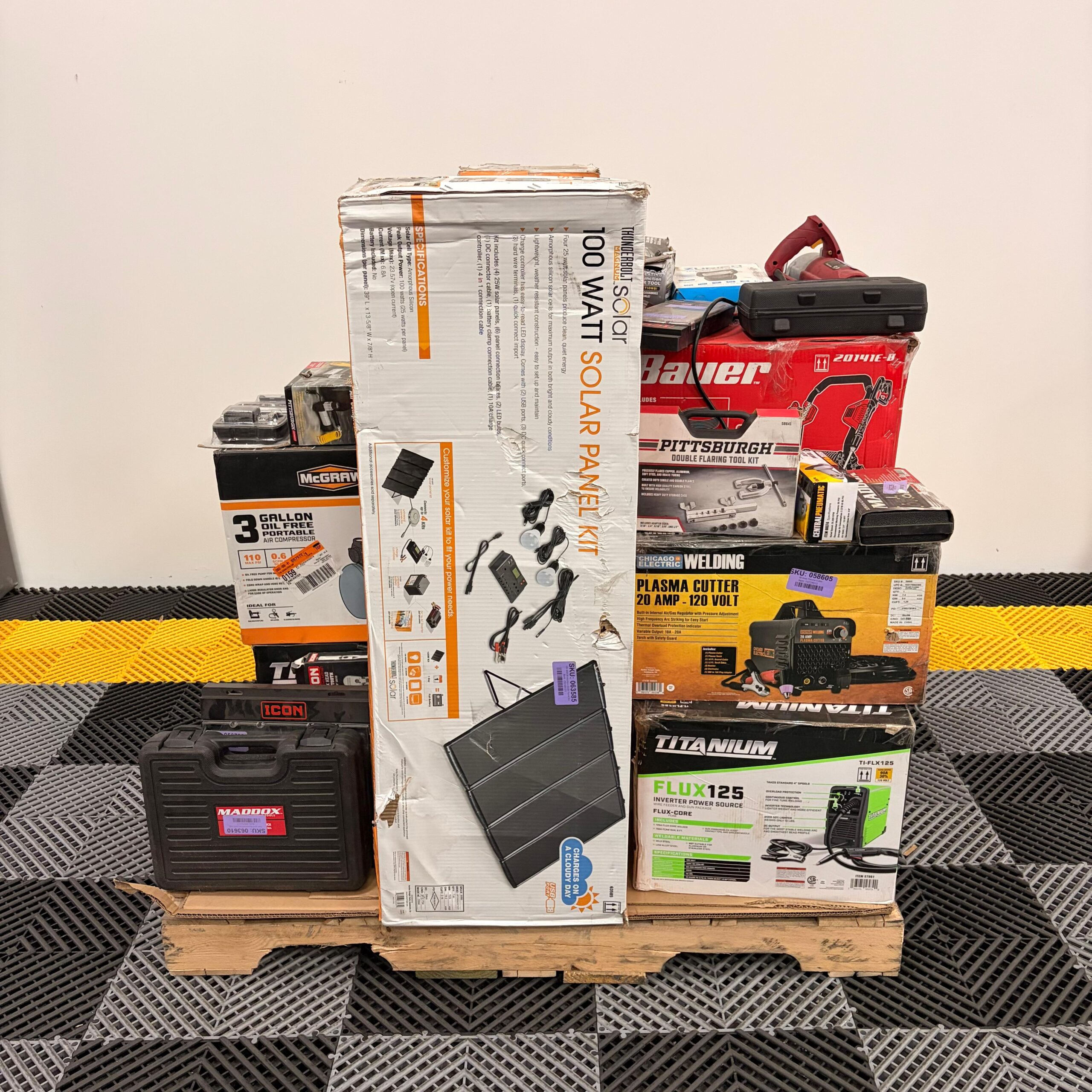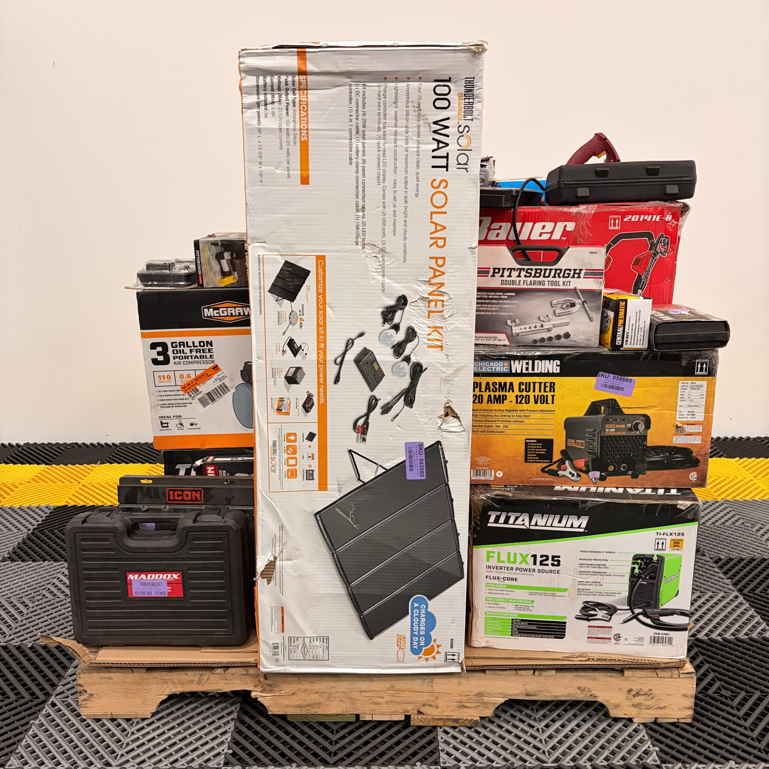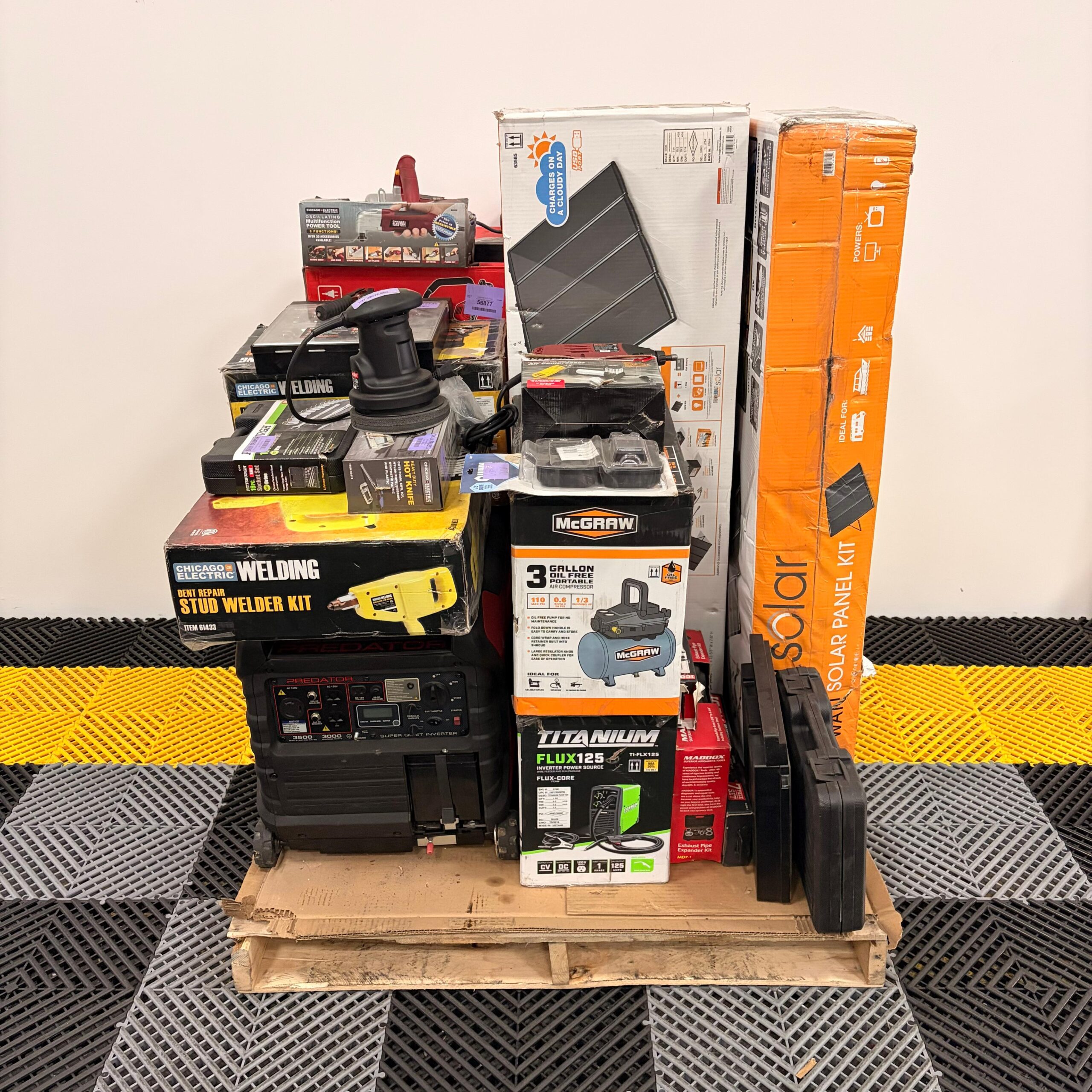 Incluye generador Predator 3500 inverter (super silencioso), hidrolavadora Bauer 2000 PSI, panel solar Thunderbolt de 100W, cortadora de plasma Chicago Electric, equipo de soldadura, lijadoras, herramientas eléctricas y accesorios diversos.
