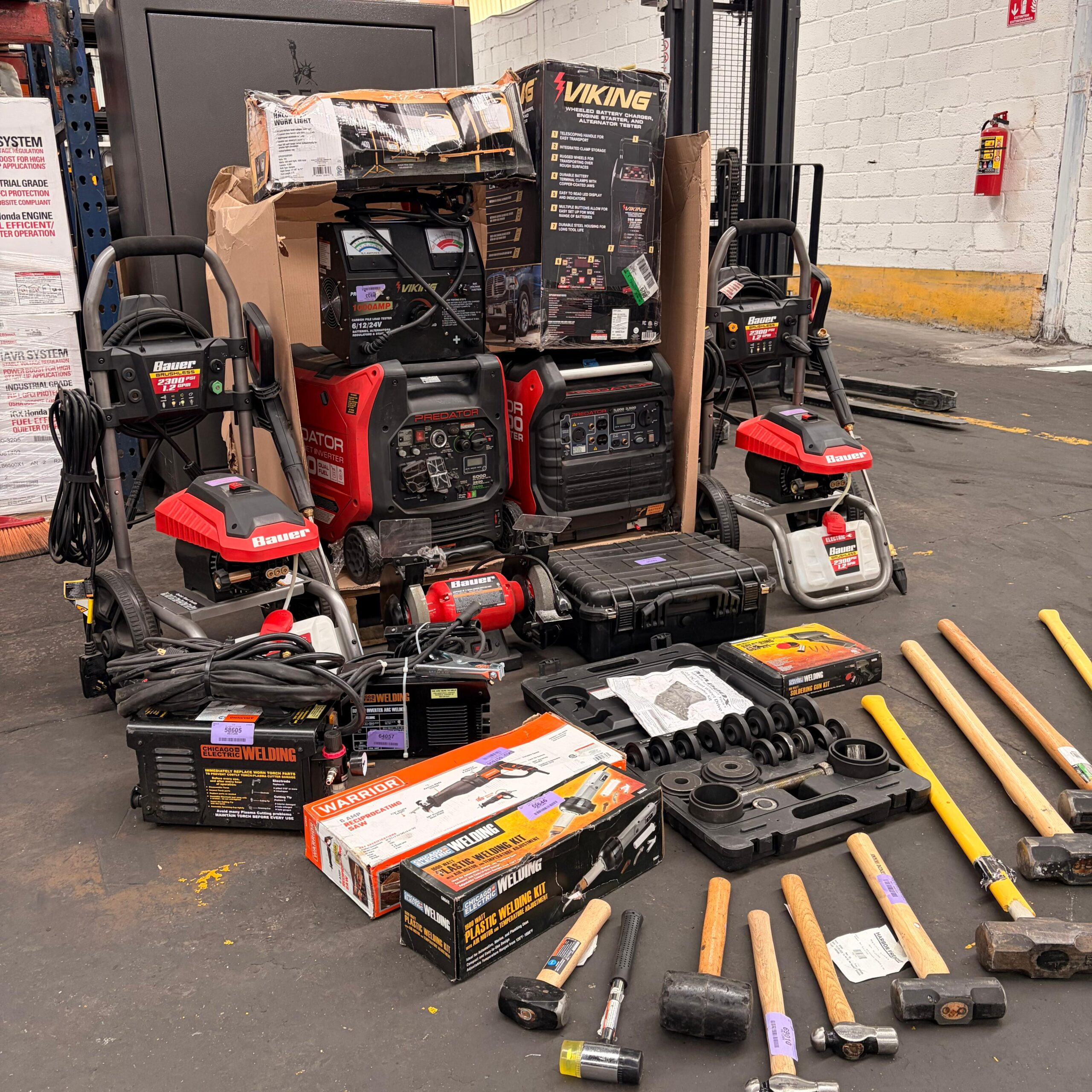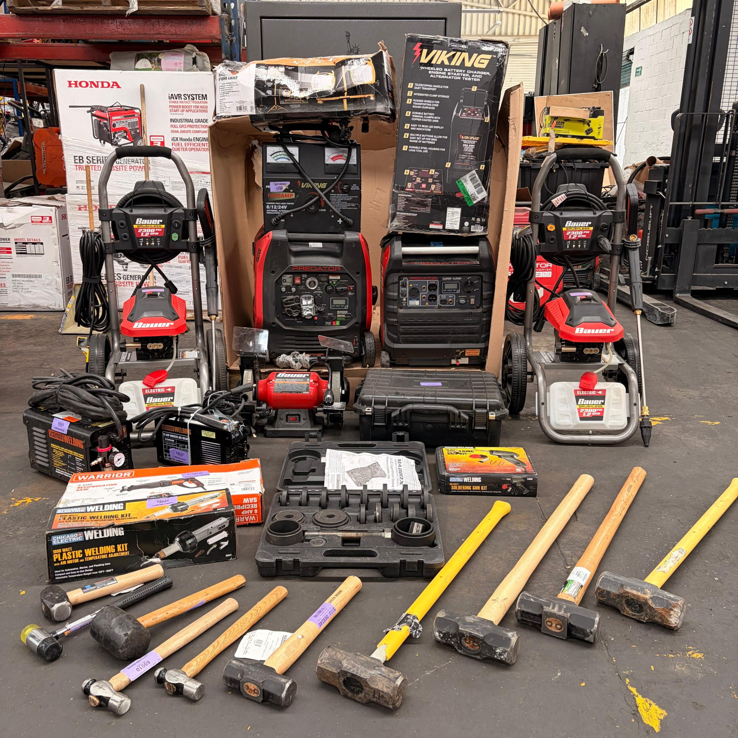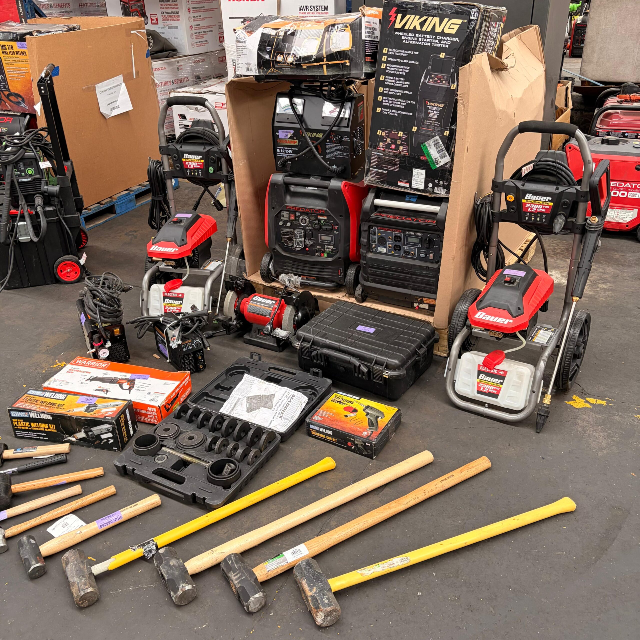 Incluye generadores inverter Predator, hidrolavadoras Bauer, equipo de soldadura, compresor, kits especializados y herramienta manual diversa.