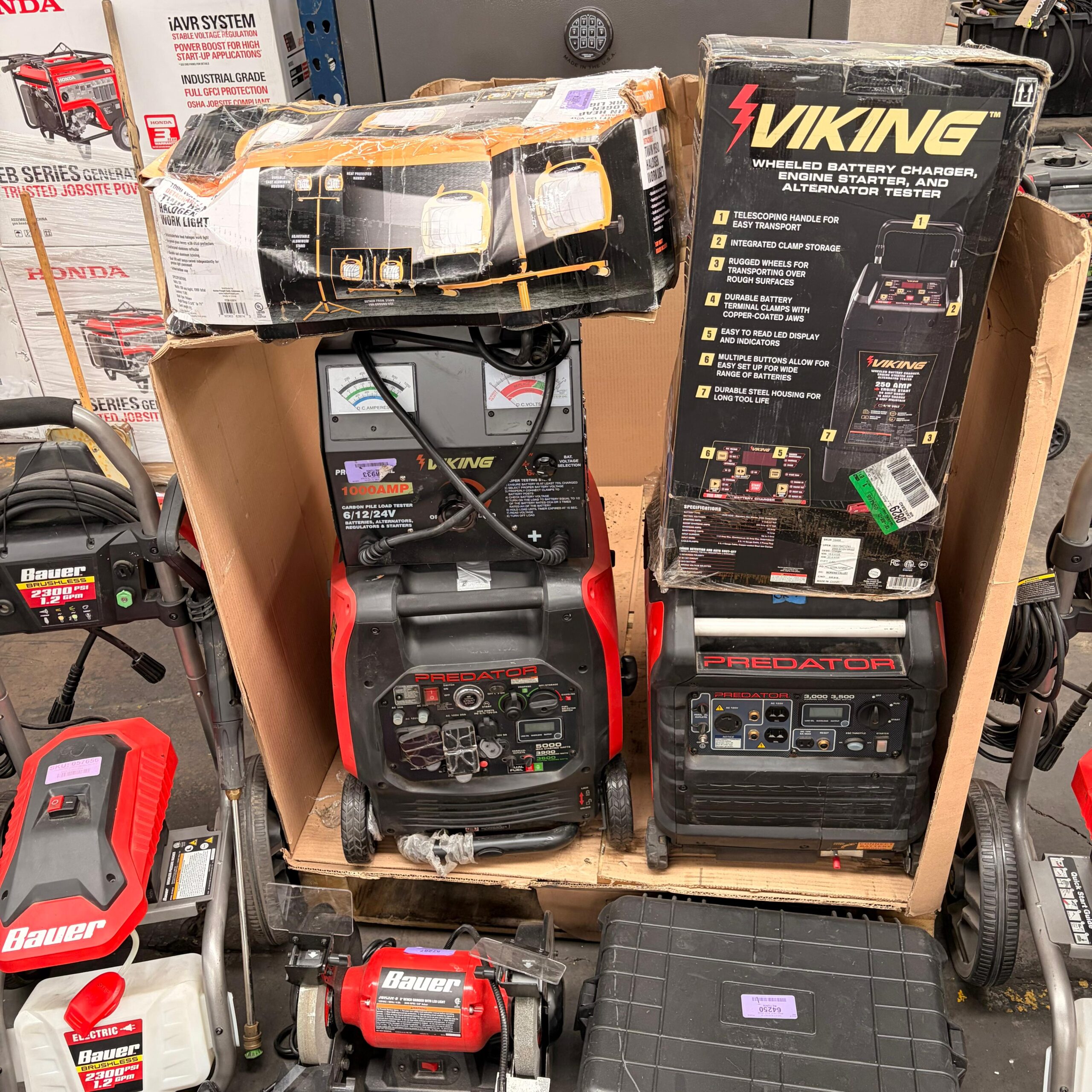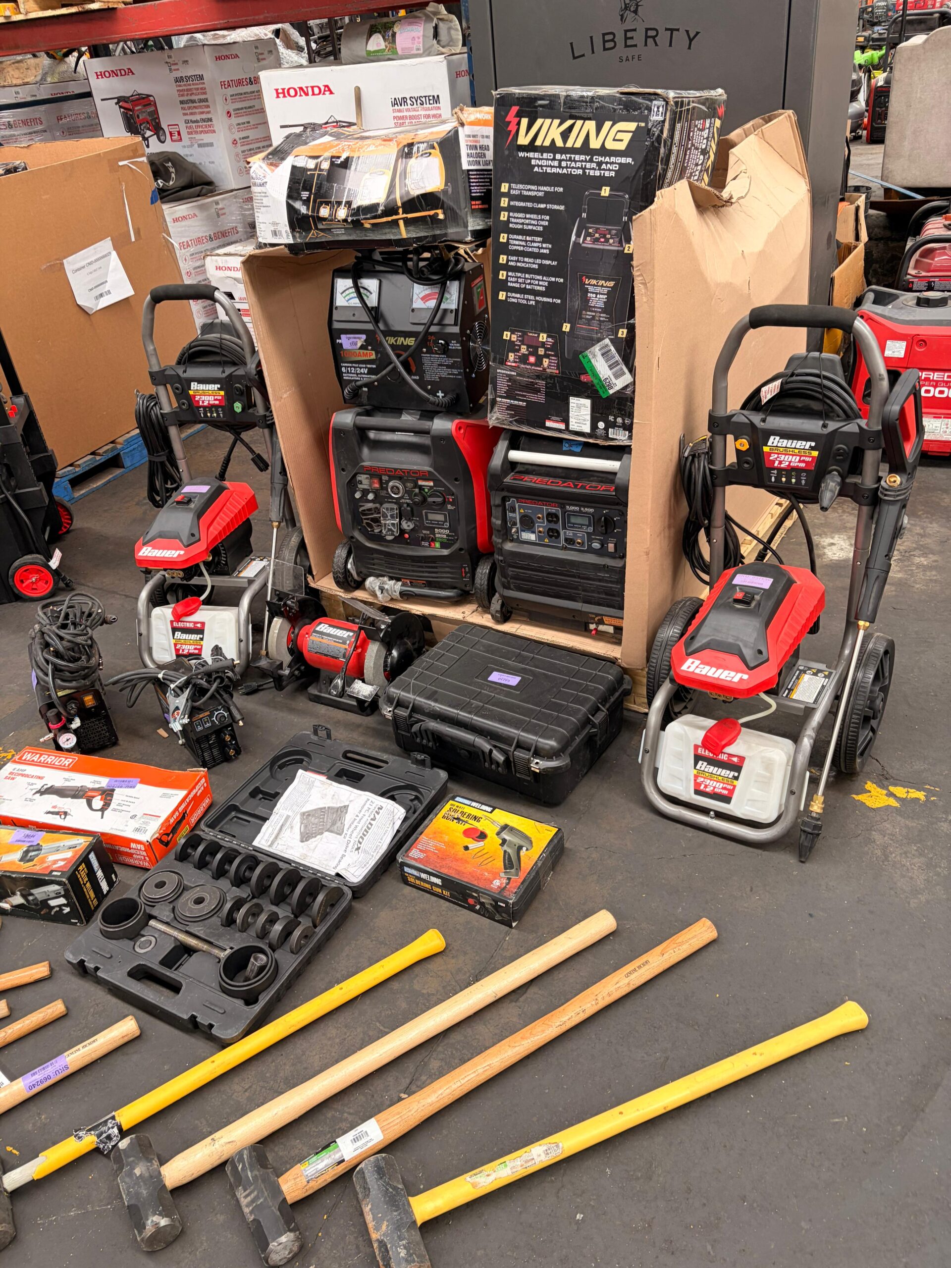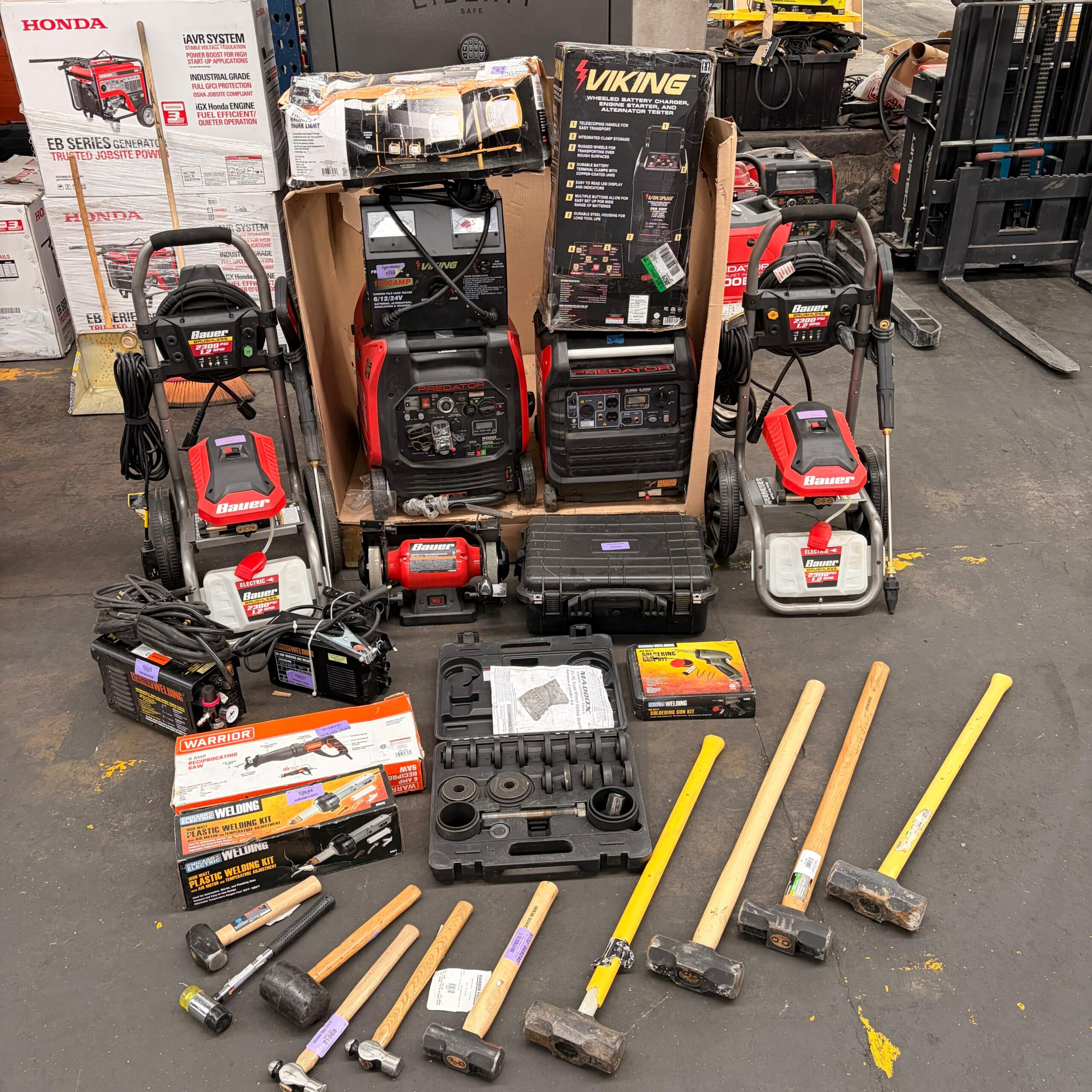 Incluye generadores inverter Predator, hidrolavadoras Bauer, equipo de soldadura, compresor, kits especializados y herramienta manual diversa.